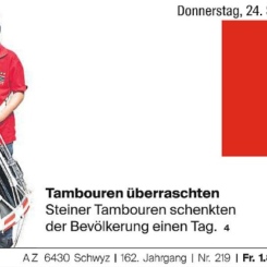 Und so zeigten die Tambouren gestern einen Teil ihres Spektrums. Morgens um 6 Uhr gab es eine traditionelle Tag wache. Zur Pause der Schule Steinen spielten sie in einem Konzert auf dem Pausenplatz, begleitet von vielen Eltern. Darauf folgte ein Fasnachtsmontag mit dem Steiner Narrentanz und Maschgraden, die das Nüsseln vorzeigten, und abends war traditionelles Gässeln angesagt. «Für uns war das mehr als nur eine Werbetour im Dorf. Die Bevölkerung war begeistert von Trommelspiel. Wir hoffen, damit wieder viele junge Talente für unsere Trommel schule zu begeistern», so Patrick Suter.